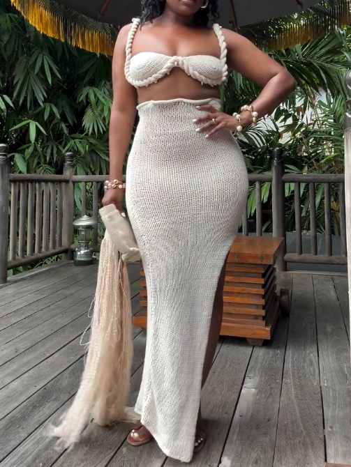 Nail new season trends with this set. Featuring a beige crochet material with a crop top design and a matching skirt with a high waisted design & maxi length.